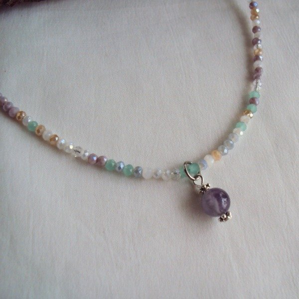 Collar gargantilla de cristales facetados con cierre y alargue de acero quirúrgico hipoalergénico, y dije de piedra natural amatista. El largo de este collar es de 40cm y su extensión permite que llegue hasta los 45cm.