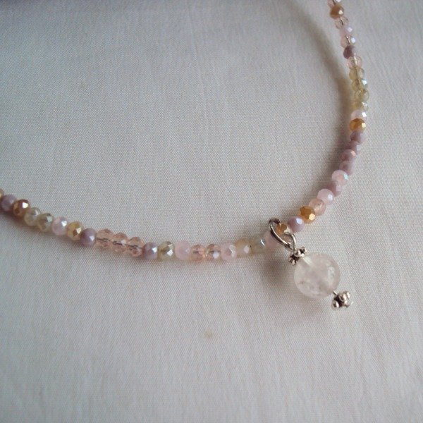 Collar gargantilla de cristales facetados con cierre y alargue de acero quirúrgico hipoalergénico, y dije de piedra natural cuarzo rosa. El largo de este collar es de 40cm y su extensión permite que llegue hasta los 45cm.