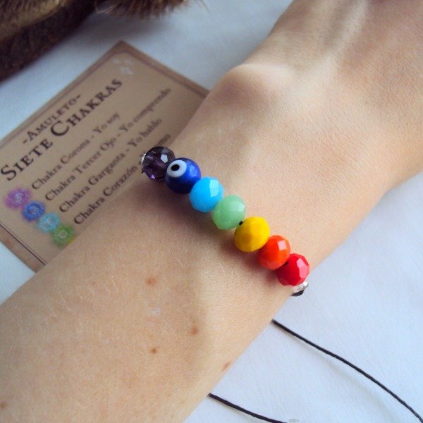 Pulsera de hilo encerado negro, con cuentas de vidrio facetado que por cromoterapia refieren a cada uno de los chakras, y con ojo turco azul en el lugar del chakra tercer ojo. Con detalles de mostacillas en las terminaciones. Ajustable, por lo que también puede usarse como tobillera. Apta agua.